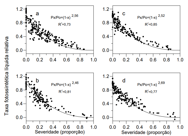 Ao analisar os efeitos da mancha-branca, causada por Phaeosphaeria maydis, na taxa líquida de fotossíntese e na transpiração de folhas de milho, Godoy et al. (2001) observaram que a doença não reduziu somente a quantidade de área foliar como também afetou a fotossíntese no tecido foliar assintomático remanescente. Com o progressivo aumento da severidade, a redução na taxa fotossintética foi proporcionalmente maior que a redução da área foliar devido às lesões (figura 2). Folhas com severidade em torno de 10-20 % apresentaram redução na taxa fotossintética líquida ao redor de 40 %.