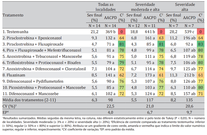 De acordo com os resultados obtidos, a maior eficiência de controle da mancha-branca foi observada com o uso de Piraclostrobina + Fluxapiroxade; seguido por Trifloxistrobina + Protioconazol + Bixafen; e Piraclostrobina + Fluxapiroxade + Mefentrifluconazol, demonstrando que produtos utilizados em forma de misturas promovem melhores resultados de controle da mancha branca em comparação ao uso de alguns ativos de forma isolada (Custódio et al., 2020).