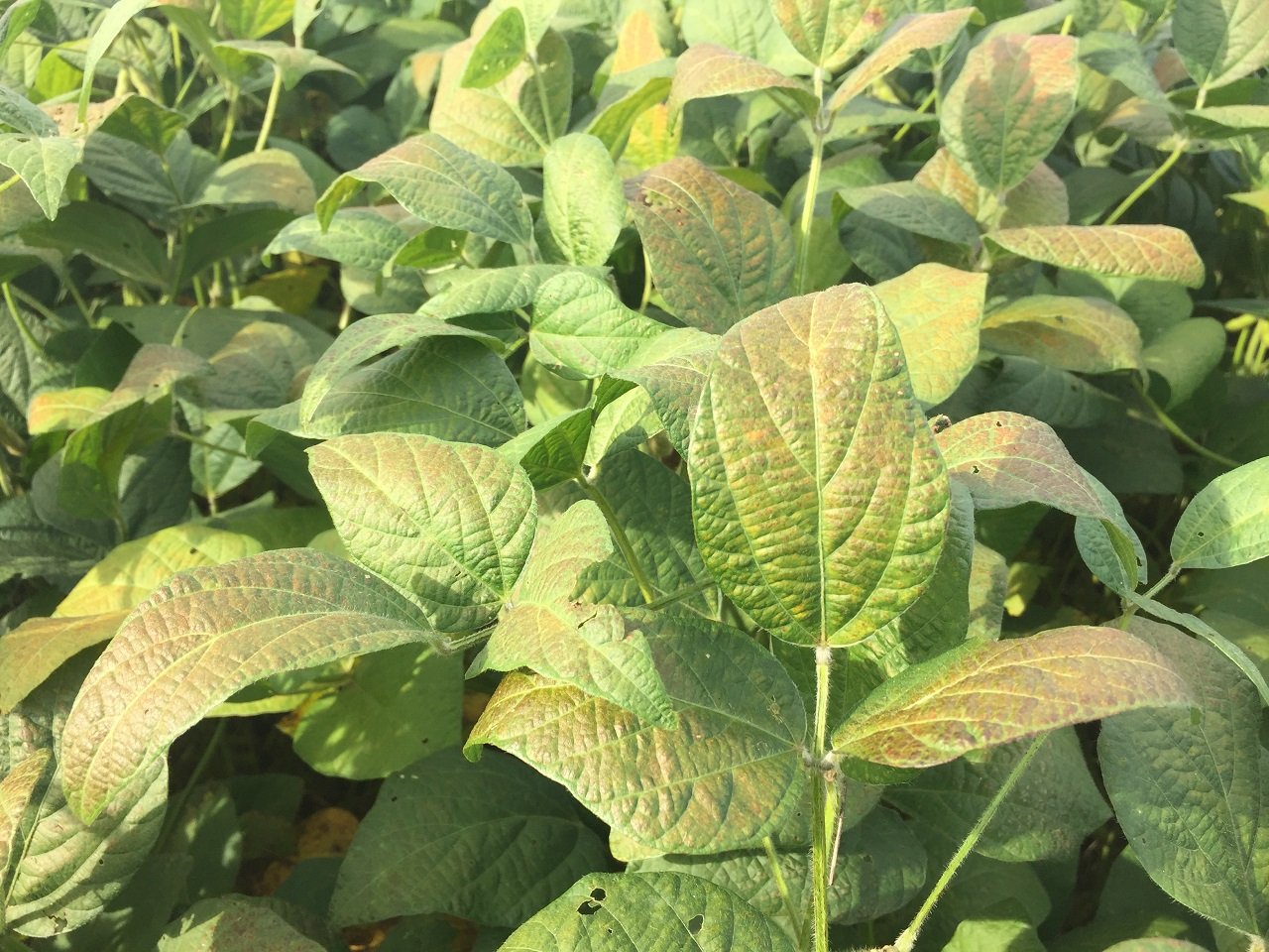 Na parte aérea da planta, os sintomas incluem o surgimento de pontuações escuras, castanho-avermelhadas, com bordas difusas, as quais coalescem e formam grandes manchas escuras que resultam em severo crestamento e desfolha prematura (Henning et al., 2014). Já nas sementes, o sintoma característico é a formação de manchas púrpuras no tegumento.