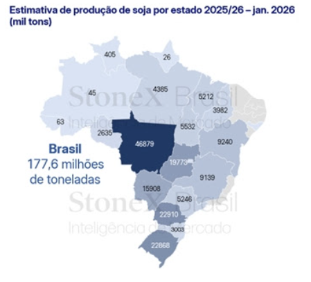 A StoneX, empresa global de serviços financeiros, revisou para cima sua projeção da safra brasileira de soja 2025/26 neste mês de janeiro, estimando 177,6 milhões de toneladas, tímida alta de 0,2% em relação ao relatório de dezembro. No comparativo anual, o avanço é mais expressivo de 5,2% acima da produção anterior.