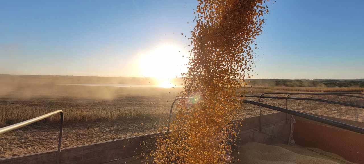 Em Garruchos, as lavouras implantadas no início de novembro apresentam sinais de final de ciclo. Já as áreas de dezembro ainda estão em enchimento de grãos, e houve formação de legumes no terço superior do dossel após chuvas recentes, o que pode resultar tanto em aumento de rendimento em cultivares de ciclo longo quanto em desuniformidade de maturação em materiais de ciclo curto.