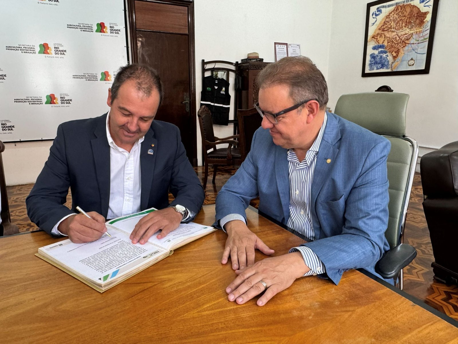 O novo presidente do Instituto Rio Grandense do Arroz (Irga), Alexandre Velho, e o secretário da Agricultura, Pecuária, Produção Sustentável e Irrigação (Seapi), Edivilson Brum, se reuniram nesta segunda-feira (9) para a assinatura do termo de posse como presidente da instituição.