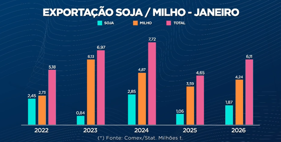 No milho, os embarques somaram 4,24 milhões de toneladas em janeiro de 2026, alta de 18% sobre as 3,6 milhões de toneladas registradas em janeiro de 2025. Assim como na soja, o volume não foi o maior da história para o mês, mesmo diante de uma safra superior a 130 milhões de toneladas.