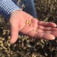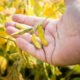 Soybean pods on soybean plantation, on farmer open palm hand background, close up. O mercado brasileiro de soja encerrou o dia sem registro de negócios, com...