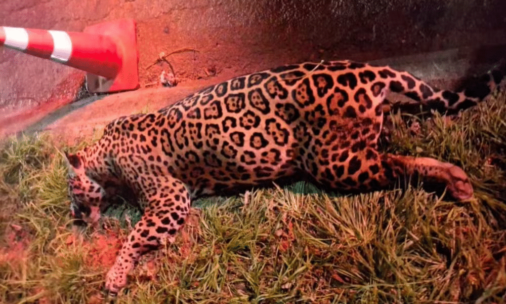 Vídeo mostra momento em que a onça cruza de repente a estrada e surpreende trabalhadores. Uma onça-pintada foi registrada correndo à beira da estrada antes de atravessar...